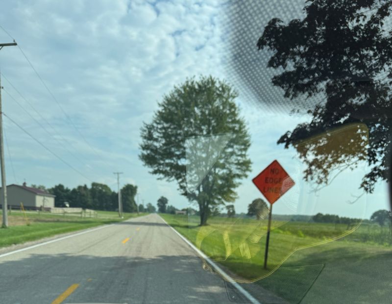 Driving my daughter to a graduation party, we spent several miles on this stretch of road in rural Ohio. The road clearly had well marked edge lines – yet every couple hundred yards we passed these bright orange signs cautioning us that those edge lines helping us to maintain our lane simply did not exist. Judging by the pavement, it didn’t seem like the road was recently resurfaced. But I might be mis-remembering. It might have been a chip and seal job and not blacktop asphalt. But even that done recently should’ve kicked up some tiny pieces of gravel or shown evidence of recently fresh tar.